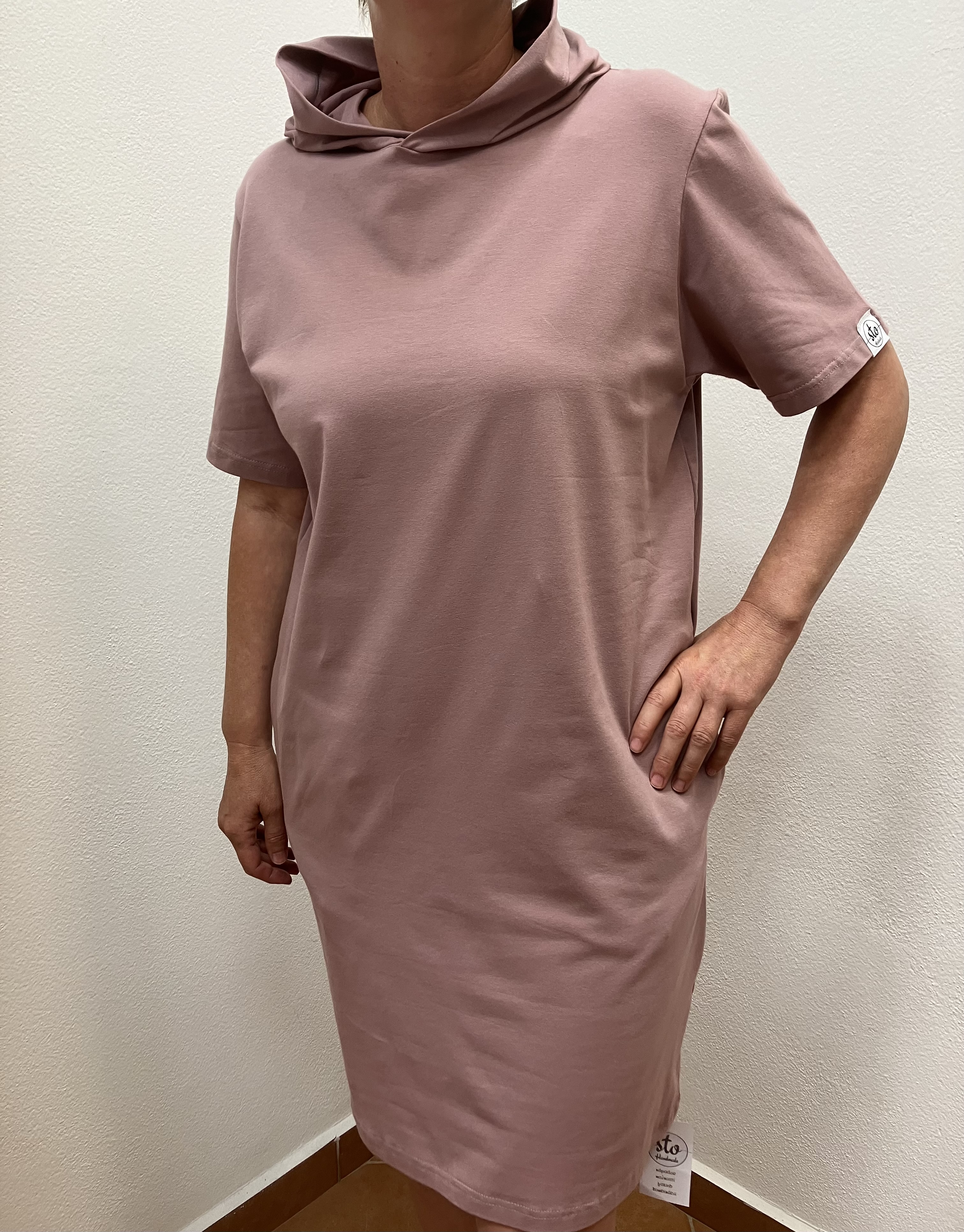 Dámske šaty krátky rukáv s kapucňou. Zloženie materiálu: 95% bavlna, 5% elastan.